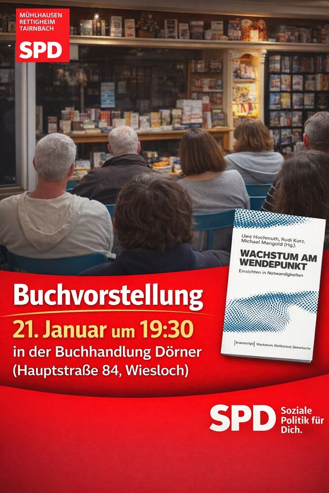 Die Buchhandlung Dörner lädt am 21. Januar um 19:30 Uhr zur Vorstellung von „Wachstum am Wendepunkt“ nach Wiesloch ein. Es werden die Zusammenhänge von „Wachstum, Wohlstand und Demokratie“ analysiert, so auch die gleichnamige Reihe der Publikation, die aus der gemeinsamen Arbeit einer Forschergruppe von Ökonomen, Klimawissenschaftlern, Soziologen, Psychologen und Philosophen hervorgeht. Da gegenwärtig von den wirtschaftswissenschaftlichen Forschungsinstituten auch die Möglichkeit einer längeren Wachstumspause als möglich erachtet wird, gilt es entsprechende Ideen und Konzepte für dieses Szenario zu entwickeln. Bislang ging man von einem quasi naturgesetzlichen Wachstum aus, das lediglich kurzfristig unterbrochen wird, daher liegen diese Konzepte eines Umgangs mit Nullwachstum noch nicht vor. Die Mitherausgeber der Reihe, Prof. Dr. Uwe Hochmuth und Dr. Michael Mangold vom Institut für Angewandte Wirtschaftsforschung Tübingen werden auch Ideen und Vorschläge erläutern, wie Gemeinden und Städten mit Nullwachstum umgehen könnten. Nicht zuletzt soll es darum gehen, welche Rolle dabei Bürgerinnen und Bürger übernehmen könnten.
